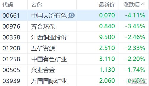 格隆汇7月14日丨铜业股普跌,中国大冶有色跌4.1%、齐合环保跌3.4%,江西铜业、五矿资源跌超2%。由于市场担忧需求放缓,以及美元走强,伦铜持续走弱,现报7260美元,跌幅1.86%;沪铜跌1%。花旗预计未来6-12个月铜价将跌至每吨6600美元,在看空的情况下为每吨6000美元。瑞银发研报指,将今明两年铜价预测分别下调9%和11%,以反映未来12个月需求增长放缓,并将江西铜业目标价下调至8港元,评级降至沽售。