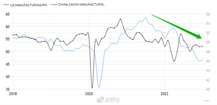 在印度尼西亚铜矿厂停产之前,铜期货和江西铜业股份已经处于中期上涨趋势之中。2022年7月15日至今,铜期货累计上涨26.01%,最高触及9550.5美元/吨;江西铜业股份累计上涨54.55%,最高触及14港元/股。本轮长是主要源于供需不平衡。铜主要应用于电气、机械制造、建筑工业、交通运输等领域。总的来说,制造业对铜的需求量最大,而衡量制造业所处经济周期的指标为制造业PMI。中国和美国是全球最大的两个经济体,两者制造业PMI数据的走向,代表了全球制造业的发展趋势。